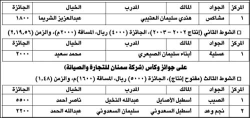 * الشوط الأول (إنتاج ثالثة وثانية 3 - 7)، الجائزة (3000ريال)، المسافة (2000م)، والزمن(2.24)