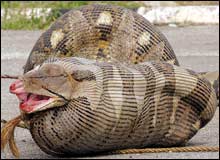 ثعبان ضخم بطول متر و وزنه 90 كجم يعترض في طريق بالقرب من قرية Kampung Jabor شرق كوالالمبور بعد أن ابتلع نعجة بكاملها وهي حامل.. (رويترز)