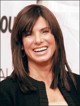 الممثلة السينمائية الأمريكية ساندرا بوليك تبتسم للمصورين أثناء حضورها حفل نساء العام السابع عشر الذي أقيم بقاعة Carnegie في نيويورك لدعم ضحايا هجمات الحادي عشر من سبتمبر وإعصار كاترينا وتسونامي ودعم جهود الإغاثة في العالم * (ا.ف.ب)