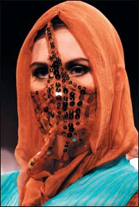 عارضة أزياء تعرض خماراً وفستاناً للمصمم الماليزي رملي أثناء مهرجان لعروض الأزياء الإسلامية في كوالالمبور (رويترز)