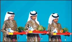 أولاد قطريون صغار بملابسهم التراثية يحملون ميداليات ذهبية لتسليمها للفائزين في دورة الألعاب الآسيوية بالدوحة حيث تم اشراك الصغار هناك لتقديم الميداليات للفائزين بالمركز الأول.