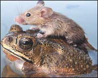 فأر يمتطي ظهر ضفدع لينجو من الغرق في فيضانات مياه مدينة Lucknow الهندية.* رويترز