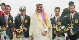رفع صاحب السمو الملكي الأمير نواف بن فيصل بن فهد بن عبدالعزيز، نائب الرئيس العام لرعاية الشباب، نائب رئيس اللجنة الأولمبية العربية السعودية، رئيس بعثة المملكة لدورة الألعاب الآسيوية الخامسة عشرة المقامة حالياً بالدوحة التهنئة لخادم الحرمين الشريفين الملك عبدالله بن عبدالعزيز، ولصاحب السمو الملكي الأمير سلطان بن عبدالعزيز، ولي العهد نائب رئيس مجلس الوزراء وزير الدفاع والطيران والمفتش العام - حفظهما الله - على ما تحقق من إنجاز للرياضة السعودية من خلال تحقيق منتخب الفروسية السعودي الميدالية الذهبية لمسابقة الفرق لقفز الحواجز. وقال سموه في تصريح صحفي عقب تتويجه فرسان المنتخبات الفائزين بالمراكز الثلاثة: (يشرفني باسم كل أفراد بعثة المملكة أن أُقدم كل ما تحقق من ميداليات ذهبية وبرونزية كأقل هدية لخادم الحرمين الشريفين الملك عبدالله بن عبدالعزيز، ولسمو ولي عهده الأمين، وللشعب السعودي الكريم الذي دعمنا بدعواته لأبطال المملكة). وأثنى سموه على المستوى الفني الذي ظهر به فرسان المنتخب السعودي أثناء أشواط منافسات بطولة الفرق الذي توجوه بالميدالية الذهبية والتي جاءت بجدارة واستحقاق للفرق المشاركة.. مُعبِّراً سموه عن شكره وتقديره لفرسان المملكة الذين أثبتوا أنهم أبطال.. متمنياً سموه استمرار تفوقهم بمسابقات الفروسية الآسيوية من خلال مشاركتهم اليوم بمسابقة الفردي.. وأكد سموه أن الطموح ما زال قائماً بمشيئة الله تعالى لتحقيق المزيد من الميداليات في بقية الألعاب. وكان سمو الأمير نواف بن فيصل بن فهد بن عبدالعزيز قد توَّج أمس فرسان منتخب المملكة لقفز الحواجز المكوَّن من الفارس صاحب السمو الملكي الأمير عبدالله بن متعب بن عبدالله بن عبدالعزيز والفارس خالد العيد والفارس كمال باحمدان والفارس عبد الله الشربتلي بعد تصدرهم المنتخبات المشاركة في الجولتين الأولى والثانية دون أي نقاط جزاء.. وجاء في المركز الثاني المنتخب الكوري وفي المركز الثالث المنتخب الإماراتي.