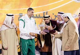 * الدمام - سامي اليوسف: بمشاركة سمو الأمير محمد بن فيصل رئيس نادي الهلال ومعالي الشيخ فيصل الشهيل عضو الشرف الهلالي قامت إدارة نادي الخليج بتكريم اللاعب حسين السبع بطل أسياد آسيا في الوثب الطويل وذلك بين شوطي مباراة الخليج والهلال في استاد الأمير محمد بن فهد بالدمام. وشارك في التكريم المهندس عبد الله السيهاتي رئيس هيئة أعضاء شرف النادي وسلمان المطرود الرئيس السابق وسط تصفيق من الحضور الجماهيري الكبير الذي اكتظت به المدرجات، حيث قدّمت الإدارة درعاً تذكارياً ومكافأة مالية للاعب السبع. من جهته قال بطل الذهب في الوثب الطويل اللاعب العالمي حسين السبع (أشكر الإدارة الخلجاوية على هذا التكريم كما أشكر لسمو رئيس نادي الهلال مشاركته وكذلك للشيخ فيصل الشيخ وجهود عضو الشرف المهندس عبد الله السيهاتي، والشكر موصول للجمهور السعودي على دعمه وتشجيعه لي وأعد الوطن بالمزيد من البطولات والإنجازات القادمة). فيما أشار محمود المطرود رئيس نادي الخليج إلى أن حفل الإدارة قد تم تأجيله ليتواكب مع الحضور الجماهيري الكبير لمباراتنا أمام شقيقنا الهلال وخصوصاً أن اللقاء منقول تلفزيونياً كي يتعرف المزيد من الجماهير على لاعبنا العالمي حسين السبع الذي يستحق هذا التكريم وأكثر.