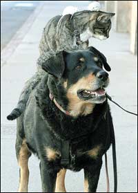 كلب مفترس تعلوه قطة مشاكسة ويعلوها ثلاثة فئران متمردة يستريحون خارج مطعم في بيسبي بآرزونا