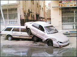 ** مناظر مؤثرة ومؤلمة عندما جرفت السيول السيارات فوق بعضها البعض أو على الأرصفة.