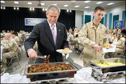 الرئيس الأمريكي (بوش) يشارك جنوده وجبة الإفطار في إحدى القواعد العسكرية بالبحرين خلال جولته الشرق أوسطية. |