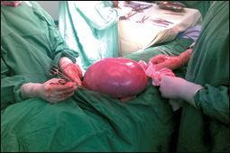 أوضح المشرف العام على مستشفى الإيمان الدكتور سعيد بن راشد الزهراني أن فريق جراحة النساء والولادة بقيادة الدكتور سمير حلواتي نجح في استئصال ورم وزنه أربعة كيلوغرامات من مبيض فتاة عمرها (13 سنة) حيث راجعت المستشفى منذ عدة أيام تشتكي من عدم انتظام الدورة الشهرية مع وجود نزيف متكرر. علماً بأنها راجعت عدة مستشفيات قبل مراجعتها للمستشفى وبعد إجراء الكشف الطبي والفحوصات اللازمة أظهرت هذه الفحوصات عن وجود ورم في المبيض الأيسر وتم إجراء العملية الجراحية لهذه الفتاة واستئصال هذا الورم وقد تكللت العملية بالنجاح.