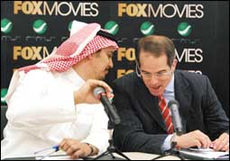 السيد نزار ناقرو رئيس روتانا للخدمات الإعلامية في حديث (هامس) للسيد وورد للات رئيس قنوات فوكس الدولية بآسيا حاجباً (الميكرفون) خلال المؤتمر الصحافي الذي عقد في مبنى المملكة بالرياض ليلة الثلاثاء لإعلان تحالف استراتيجي لخدمات روتانا وإطلاق قمر صناعي انجليزي وإتاحة الفرصة للمشاهدين بالشرق الأوسط لمشاهدة ...>>>... | |