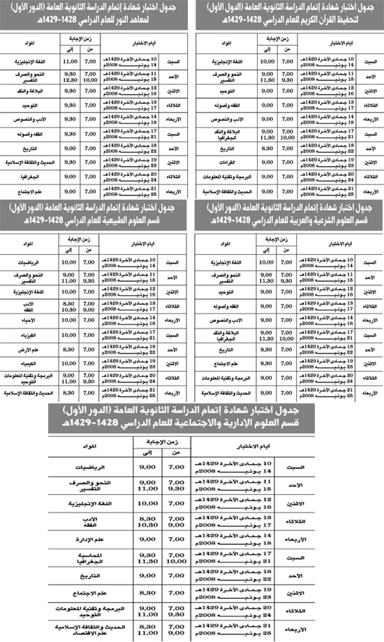من جهتــه اعتمد معالــي نائب وزير التربية والتعليم للبنين د. سعيد بن محمد المليص جداول اختبارات الثانوية العامة لجميع الأقسام وفيما يلي تنشر (الجزيرة) الجداول كاملة بعد اعتمادها.