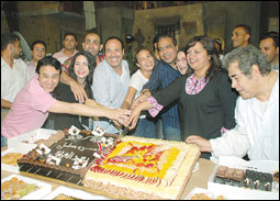 فريق ممثلي مسلسل (بعد الفراق) يحتفلون بزميلتهم شيرين عادل في استوديو ميسر في مدينة الجيزة، المسلسل مقرر عرضه خلال شهر رمضان المبارك.* ا.ف.ب |