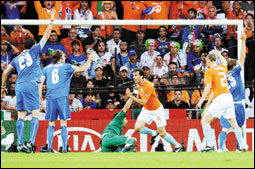 لقن المنتخب الهولندي نظيره الإيطالي بطل العالم درسا في فنون اللعبة عندما سحقه بثلاثية نظيفة على ملعب (ستاد دو سويس) في بيرن في الجولة الأولى من منافسات المجموعة الثالثة ضمن نهائيات كأس أوروبا 2008م، وسجل رود فإن نيستلروي (26) وويسلي شنايدر (31) وجيوفاني فإن برونكهورست (79) الأهداف. |