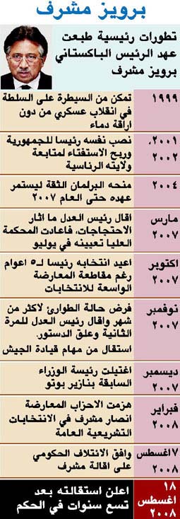 وتعرض مشرف الذي استولى على السلطة في انقلاب أبيض عام 1999م، لضغوط هائلة من الائتلاف الحاكم، لتقديم استقالته قبل بدء أول إجراءات مساءلة في تاريخ باكستان منذ استقلالها قبل 61 عاماً.