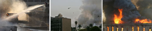 وقال شهود من رويترز إن طائرات هليكوبتر حلقت فوق نهر النيل لغرف المياه في حاويات معلقة تحتها قبل التوجه إلى البرلمان وإلقاء المياه فوق ألسنة اللهب. وقال شاهد من رويترز إن عشر عربات إطفاء شاركت في محاولة إطفاء النيران. وذكر مصدر أمني أن الجيش استدعي للمساعدة في إطفاء النيران.