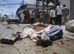 شهد الصومال أمس الخميس أعمال قصف في مقديشو قتل خلالها ستة مدنيين في حين أدت معارك دائرة منذ الأربعاء بين مقاتلين إسلاميين وميليشيات محلية إلى مقتل 22 شخصاً في كيسمايو جنوب البلاد، كما أفاد شهود ومصدر طبي. وهاجم مسلحون بقذائف الهاون والمدافع الثقيلة القصر الرئاسي في مقديشو. وقال شهود إن قوات صومالية يدعمها الجيش الإثيوبي ردت على القصف الذي أصاب حي بكارة المجاور الأكثر اكتظاظاً جنوب مقديشو، ما أدى إلى مقتل ستة أشخاص. وفي كيسمايو، على بعد 500كم جنوب مقديشو، دارت معارك منذ الأربعاء بين حركة الشباب الأصولية وميليشيات محلية، أسفرت عن مقتل 22 شخصاً وفق حصيلة جديدة.