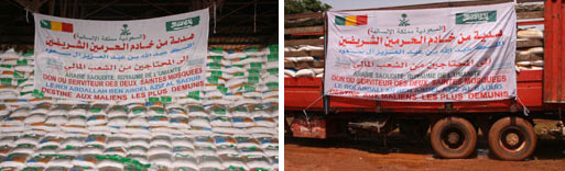 إنفاذاً لتوجيهات خادم الحرمين الشريفين الملك عبدالله بن عبدالعزيز آل سعود - حفظه الله - سُلمت أمس المساعدات السعودية الإغاثية الإنسانية إلى جمهورية مالي وذلك إسهاما من المملكة خلال شهر رمضان المبارك في التخفيف من آثار الجفاف وغزو أسراب الجراد للمحاصيل الزراعية بمالي التي تعرضت لها في الآونة الأخيرة.