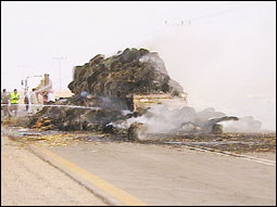تعرضت شاحنة محملة بأعلاف التبن عصر قبل يوم أمس كانت قادمة من الجمش للبجادية وبالتحديد بالقرب من قرية سليسان شمال البجادية 15كم إلى اشتعال النيران في حمولتها، ومن شدة الرهبة استوقفها سائقها على الطريق العام وأغلق الطريق وعطل الحركة المرورية لأكثر من عدة ساعات، وقد أسفر حادث الحريق عن نجاة سائق الشاحنة واحتراق كامل حمولة التبن.