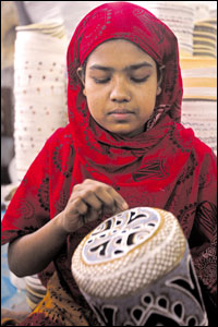 طفلة بنغلاديشية تعمل في مصنع قبعات مزركشة استعداداً لطرحها بالأسواق مع ملابس العيد. |