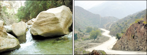الطريق الذي يتلوى صعوداً وهبوطاً حتى وصلنا المنطقة الوعرة التي لا تتجاوز أكثر من 2كلم.. التي يمكن لمعظم فئات السيارات العادية عبورها، كما أنها تحظى بصيانة يومية ودورية.