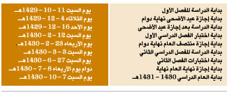 يتسمر أكثر من 5 ملايين طالب وطالبة اليوم على مقاعدهم الدراسية بعد أن تمتعوا بأطول إجازة امتدت قرابة 109 أيام بدأت من يوم الأربعاء 21 - 6 إلى يوم أمس الجمعة الموافق 10 - 10 من العام الجاري 1429هـ ويعتبر العام الدراسي الفائت أول عام يخلو فيه شهر رمضان المبارك من الدراسة ...>>>... | |