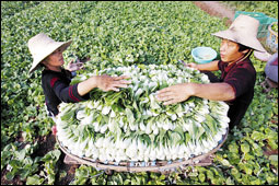 مزارعان صينيان في أحد الحقول، بمحافظة ووهان في ظل دعوة الجزء الشيوعي إلى مضاعفة دخول ملايين الفلاحين بحلول عام 2020 . |
