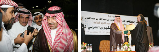 عقب ذلك تم تكريم المتميزين. وقد فاز بجائزة التميز عمادة المكتبات بجامعة الملك عبدالعزيز، وجائزة استخدام المعلومات ديوان المحاسبة بدولة الكويت، وجائزة التعامل مع الفهرسة دار الحكمة، والفهرس المتميز فاز بها أحد موظفي مكتبة الملك عبدالعزيز العامة. عقب ذلك أدلى سموه بتقديم للصحفيين قال سموه إن خادم الحرمين الشريفين يدعم دعماً كاملاً مشروع الفهرس العربي الموحد ويحثنا أكثر فأكثر على نجاح هذا المشروع، والحمد لله أثمرت هذه التوجهات وهذا الدعم من خلال هذا اللقاء الثاني لهذا التجمع.. والقادم بإذن الله أكثر.