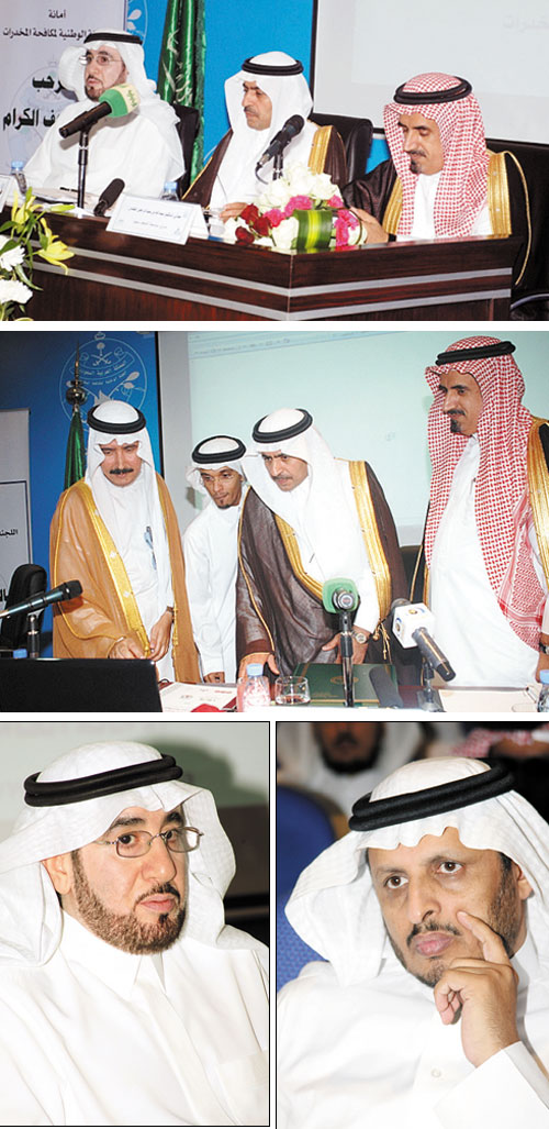 ** د. أحمد السالم ود. عبدالله العثمان ود. مفرج الحقباني سلموا المشاركين في البرنامج التدريبي للوقاية من المخدرات شهاداتهم.