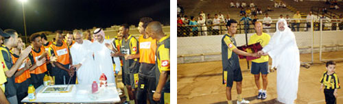 وفي سياق آخر قامت الجماهير الاتحادية مساء أمس وقبل انطلاق المران بتكريم المهاجم نايف هزازي؛ وذلك لنجوميته الكبيرة التي ظهر بها في مباراة الفريق الأخيرة أمام أبها، فيما قامت رابطة المشجعين بقيادة صالح القرني بالاحتفال بشكل خاص بمدير الكرة حامد البلوي وذلك بمناسبة مولودته الجديدة. وبعد الانتهاء من مراسم الاحتفالات انطلق المران الذي ركز فيه المدرب كالديرون على معالجة الأخطاء الدفاعية التي وقع فيها اللاعبون في المباريات الماضية فيما خضع لاعبو الوسط والهجوم إلى تدريبات مكثفة من خلال التسديد من مسافات بعيدة.
