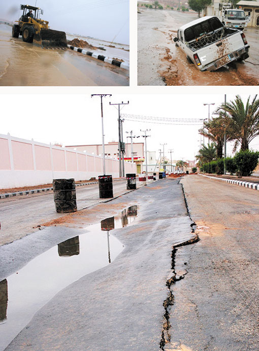 كما أثرت غزارة المياه التي هطلت على محافظة شقراء بداية هذا الأسبوع عن خطر يهدد البنية التحتية للمحافظة، فقد شهدت أرضية الشوارع هبوطاً بسبب خلل في عملية ردم مشروع الصرف الصحي الذي ينفذ في المحافظة، وقد سقطت عدد من السيارات في هذه الحفريات التي سبق ردمها وأغلقت الشوارع.