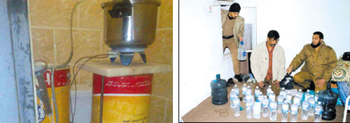 امتداداً لعمليات القبض المستمرة التي تقودها شرطة منطقة الرياض ممثلة بقوة المهمات والواجبات الخاصة على مرتكبي الجرائم ونشر الفساد عليه، فقد اشتبهت إحدى فرق البحث والتحري بقوة المهمات والواجبات الخاصة بأحد العمالة الوافدة من الجنسية الهندية يعمل بائعاً بإحدى المحلات داخل أحد المتنزهات البرية بالثمامة، حيث لوحظ كثرة تردد العمالة الوافدة عليه بأوقات مختلفة، وبضبطه عثر بحوزته على قارورة مليئة بالخمر كان يقوم بترويجها، وبمناقشته أفاد أنه يقوم بشرائها من شخص آخر من بني جلدته.. وبالشخوص للعامل الثاني وضبطه عثر لديه على ستة قوارير مليئة بالخمور يقوم ببيعها وترويجها. وبمناقشته اعترف أنه يقوم بشرائها من شخص ثالث من بني جلدة يعمل سائقاً خاصاً لدى إحدى الأسر السعودية بالرياض. وبالتوجه لمقر سكن السائق بمنزل كفيله وبالتنسيق مع الكفيل تم ضبط السائق وعثر في داخل غرفته بالمنزل على مصنع متكامل لصناعة الخمور وفي وضع العمل، كما عثر على تسعة براميل سعة البرميل عشرين لتراً جميعها مليئة بالخمور، وعثر على كرتون من المسكر بداخلة اثنتي عشرة قارورة كبيرة مليئة بالمسكر ومجموعة جراكل أمام غرفته مليئة بالمسكر وجاهزة للبيع. وبمناقشة السائق اعترف بقيامه بإعداد مسكنه مصنعاً لإنتاج الخمور المصنعة محلياً (العرق) وأنه يقوم بالتصنيع والترويج بهدف الكسب المادي دون علم كفيله بهذا العمل. من جهته أبدى كفيل السائق استغرابه من قيام سائق العائلة بهذا العمل موضحا أن السائق يعمل لديه منذ أربع سنوات.