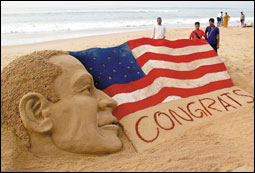 تمثال رملي للرئيس باراك أوباما الرئيس الأمريكي الجديد يقدمها أحد الفنانين الهنود كهدية على الفوز |