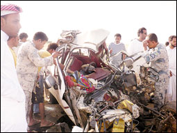لقي شخصان مصرعهما وأصيب ثالث في عناق حديدي مميت بين سيارتين واصطدام وجهاً لوجه على طريق أبو عريش - جازان وذلك بسبب التجاوز الخاطئ والسرعة الجنونية. وقد نُقل المصاب إلى مستشفى الملك فهد عن طريق فرق من الهلال الأحمر، فيما نُقل المتوفان إلى ثلاجة الموتى. وقد شهد موقع الحادث تجمهر من الفضوليين مما أعاق عمل رجال الدفاع المدني. باشرت الحادث فرق من الدوريات الأمنية وفرق من الهلال الأحمر ومن الدفاع المدني.