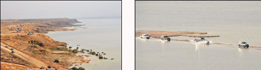 قطعت مياه بحيرة مركز العوشزية شرق عنيزة الطريق الذي يخترقها من المنتصف تقريبا وأصبح الوضع خطيرا ويهدد حياة المتنزهين وقائدي السيارات الذين يحاولون العبور رغم أن منسوب المياه مرتفع والتشققات بدت ظاهرة على سطح الطريق.