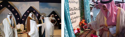 عقب ذلك قام بإزاحة الستار عن اللوحة التذكارية وقص الشريط إيذانا بافتتاح معرض الوسائل الرقابية واطلع سموه على ما يضمه من عينات من الضبطيات والبضائع المهربة وما اشتمل عليه من معروضات وصور ومجسمات تعريفية وتوعوية ولوحات توضح جهود منفذ الطوال في مكافحة المخدارت والغش التجاري في الصناعات المقلدة.