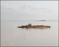 طفلان يستمتعان بوقتهما في جزيرة خلفتها مياه الأمطار وسط روضة مهنا. |