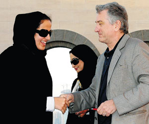 الممثل السينمائي الأمريكي روبيرت دي نيرو مصافحا الشيخة الميساء بنت حمد آل ثاني ابنة أمير قطر في مقر متحف الفنون الإسلامية بالدوحة خلال توقيع عقد شراكة لاطلاق مهرجان الدوحة السينمائي الجديد المنبثق عن مهرجان ترابيكا الدولي الذي أسس في نيويورك بعد أحداث الحادي عشر من سبتمبر وسيسمى المهرجان (مهرجان ترابيكا...>>>... | |