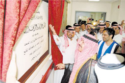 وفور وصوله مقر المستشفى قص شريط الافتتاح ثم استمع لشرح مفصل عن أقسام وخدمات المستشفى ثم أزاح الستارة التذكارية.
