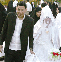 عريسان عراقيان يعبران بغية الوصول إلى موقع حفل عرس جماعي شمل 200 عريس نظّمته الحكومة المحلية العراقية في منطقة حيلا جنوب بغداد |