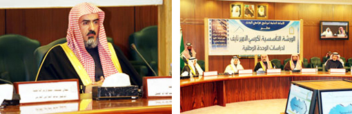 وأعرب معاليه خلال رعايته صباح يوم أمس عند الساعة العاشرة والنصف وبحضور معالي مستشار سمو وزير الداخلية الدكتور ساعد العرابي الحارثي الورشة التأسيسية (لكرسي الأمير نايف لدراسات الوحدة الوطنية)، وذلك في القاعة المستديرة بمبنى المؤتمرات والتعليم المستمر في المدينة الجامعية، عن سعادته وفخره واعتزازه عن الالتقاء في الورشة التأسيسية لكرسي الأمير نايف بن عبدالعزيز للوحدة الوطنية، موضحا أن الكرسي يأخذ أهميته من جانبين، الجانب الأول أنه يعنى بأقوى وأفضل وحدة وطنية عرفها التاريخ المعاصر (وحدة المملكة العربية السعودية)، والجانب الآخر يتمثل في أن راعيه وداعمه أمير السنة والأمن والفكر والوطنية صاحب السمو الملكي الأمير نايف بن عبدالعزيز آل سعود وزير الداخلية.