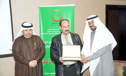 وقد قدم الدكتور - محمد صعيدي درعا تذكاريا لمدير صحة القصيم، بعد ذلك تم توزيع شهادات الشكر والتقدير على المحاضرين والعاملين بالشئون الصحية بالقصيم الدكتور سرور يسلم شهادة تقدير.