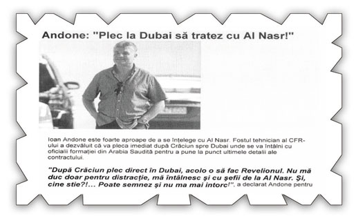 آخر تصريحات المدرب بثتها صحيفة (سبورت الرومانية) أمس وفيها جدد تأكيداته أنه مغادر إلى دبي بعد انتهاء الاحتفال بأعياد الميلاد وسيلتقي في المدينة الإماراتية حسب تصريحاته وفدا من كبار مسؤولي النصر لتوقيع العقد النهائي.