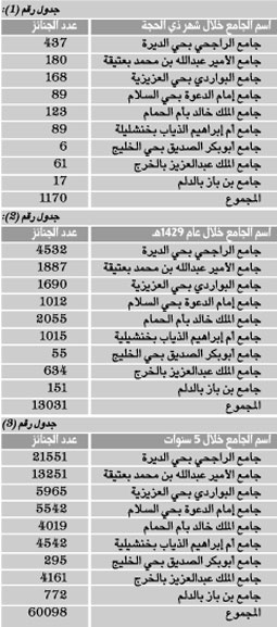 وفي عام 1429هـ كان عدد الجنائز (13031) جنازة بينهم الطفل والشيخ والمرأة والرجل والشباب والشابات موزعة كما في جدول رقم (2).