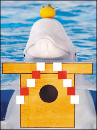 حوت أبيض يضع برتقالة على رأسه في عرض بهلواني يقوم به احتفالاً بالسنة الميلادية الجديدة في حديقة للأسماك باليابان.