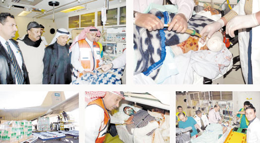 وأوضح رئيس الفريق الطبي الميداني الدكتور خالد الحبشي أن الطائرة تحمل على متنها 5 مصابين بإصابات متفرقة مؤكداً أن الكادر الطبي المجهز بالطائرة على استعداد تام بإذن الله للتعامل مع مثل هذه الحالات. وقد قامت سفارة خادم الحرمين الشريفين ممثلة برئيس فريق عملها حسن البحيري بالتعاون مع الهلال الأحمر السعودي بالتنسيق مع السلطات المصرية المختصة لنقل المصابين والجرحى ليتم علاجهم بمستشفيات المملكة.