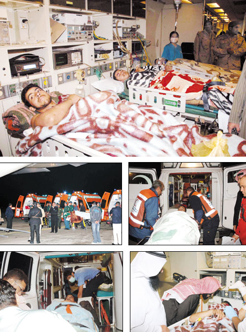 وقد أعدت وزارة الصحة وهيئة الهلال الأحمر السعودي فرق طوارئ بانتظار الجرحى في المطار لتوزيعهم على عدد من المستشفيات في الرياض وسط متابعة من صاحب السمو الملكي الأمير فيصل بن عبد الله بن عبدالعزيز رئيس هيئة الهلال الأحمر السعودي ومعالي وزير الصحة الدكتور حمد بن عبدالله المانع.
