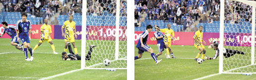 فمن هجمة هلالية منظمة يمرر رودي كرة طويلة لويلي يحولها عرضية في منطقة الجزاء يتسلمها ياسر بصدره من بين المدافعين ويسددها أرضية على يسار راضي وسط الزحام داخل الشباك هدفاً هلالياً أول فتح المباراة ورجح كفة الهلال كثيراً ليتدخل مدرب النصر مرة جديدة ويخرج غالب ويشرك العماني ربيع في محاولة للتعديل غير أن الهلال عاد للمباراة فعلياً وتحسن أداء وسطه كثيراً بعد أن قلت الكثافة العددية وسط الميدان ليضيف هدفاً ثانياً من كرة رائعة للنجم الجديد رادوي.