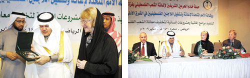 حيث وقّع الاتفاقية من جانب الحملة معالي مستشار سمو وزير الداخلية رئيس حملة خادم الحرمين الشريفين لإغاثة الشعب الفلسطيني بغزة الدكتور ساعد العرابي الحارثي، فيما وقّعها عن الوكالة المفوض العام ل (الأنوروا) السيدة كارين أبو زيد.