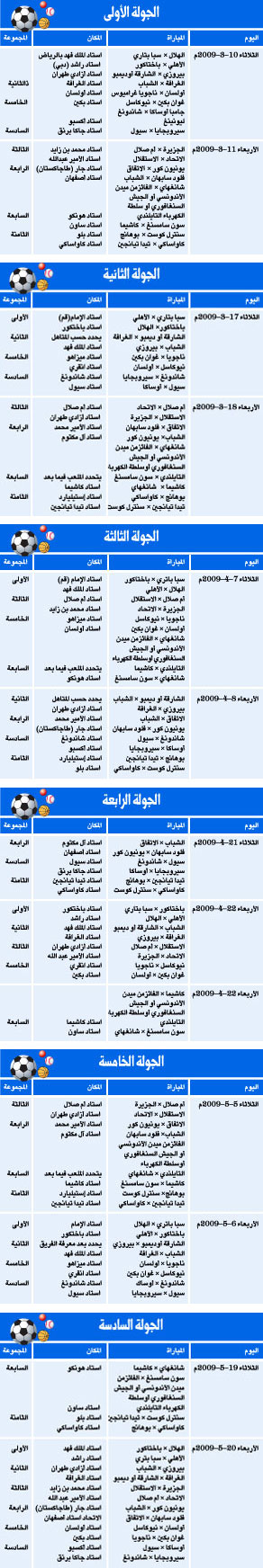 الأولى: الهلال السعودي والأهلي الإماراتي وباختاكور الأوزبكي وسبا باتري الإيراني.. فيما ضمت المجموعة الثانية: الشباب السعودي الغرافة القطري وبيروزي الإيراني والشارقة الإماراتي أو ديمبو الهندي.. وضمت المجموعة الثالثة: الاتحاد السعودي والجزيرة الإماراتي وأم صلال القطري والاستقلال الإيراني.. أما المجموعة الرابعة فقد ضمت: الاتفاق السعودي والشباب الإماراتي ويونيو كور الأوزبكي وفلولاذ سابهان الإيراني.. كما ضمت المجموعة الخامسة: أولسان هونداي الكوري ونيوكاسل جنتس الإسترالي وغوان بكين الصيني وناجويا غرامبوس ايت الياباني.. أما المجموعة السادسة فقد ضمت: جامبا أوساكا الياباني وسيول الكوري وسيروبجايا الأندوييسي وشاندونغ ليونينغ الصيني.. كما ضمت المجموعة السابعة كلا من: شانغهاي شنهو الصيني وكاشيما أنتلز الياباني وسون سامسنغ بلووينغز كوريا الجنوبية والفائز من ميدن الأندونسي أو الجيش السنغافوري أو سلطة الكهرباء التايلندي.. أما المجموعة الثامنة فقد ضمت: سنترل كوست الأسترالي وتيدا تيانجين الصيني وكاواساكي الياباني وبوهانج الكوري الجنوبي، حيث ستنطلق مباريات هذه البطولة اعتباراً من يوم الثلاثاء العاشر من شهر مارس على النحو التالي: