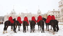 خيالة تابعون للحرس الملكي البريطاني ممتطون صهوة جيادهم منتظرون زملاءهم لتغيير (نوبتهم) الاستعراضية؛ حيث شلت الحركة في لندن التي غطتها طبقة ثلوج بلغت سماكتها 10 سنتيمترات.
