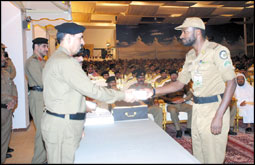 كرم معالي مدير الأمن العام الفريق سعيد بن عبد الله القحطاني العريف خالد الفرج المكلف بالعلاقات العامة بمدينة تدريب الأمن العام بالقصيم والمنسق الإعلامي لمجلة التدريب بالقصيم، وذلك أثناء رعاية معاليه لحفل اختتام الموسم الثقافي والمسرحي لطلبة مدن تدريب الأمن العام والذي أُقيم بمنطقة مكة المكرمة مؤخراً. تهانينا للزميل الفرج وبالتوفيق الدائم إن شاء الله.